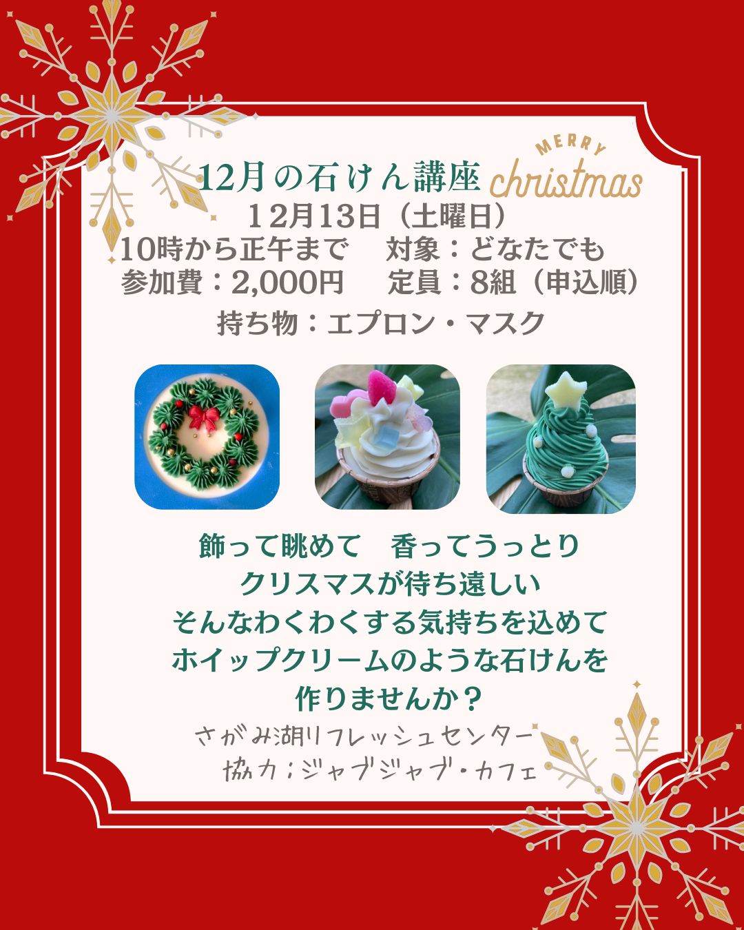 令和7年12月13日(土曜日)石けん講座「クリスマスソープ」開催します