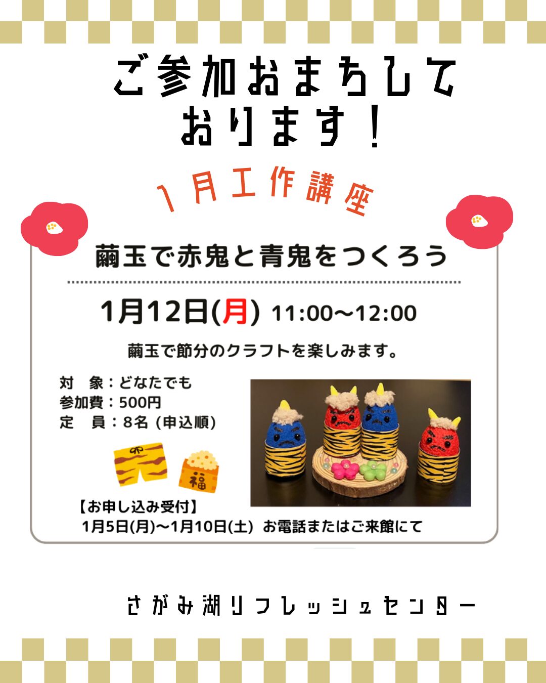 2025.12.22 令和8年1月12日(月曜日・祝日)「繭玉で赤鬼と青鬼をつくろう」開催します 繭玉で節分のクラフトを楽しみます。 日時:令和8年1月12日(月曜日・祝日)午前11時から正午まで 対象:どなたでも 定員:8名(申込順) お申込み:令和8年1月5日(月曜日)から令和8年1月10日(土曜日)まで、お電話またはご来館にてお申込みください。 ☎:042-685-3988