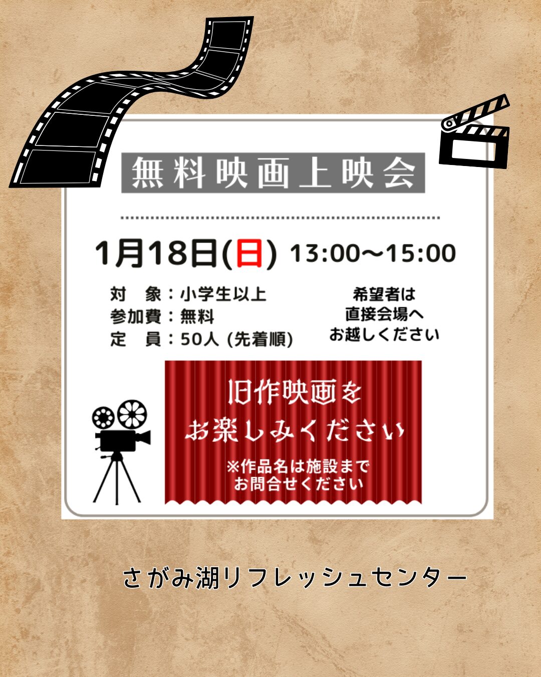 2025.12.23 令和8年1月18日(日曜日)「無料映画上映会」開催します 無料映画上映会 懐かしい旧作の映画を楽しみます。 日時:令和8年1月18日(日曜日)午後1時から午後3時(開場:12時30分) 対象:小学生以上 定員:50名(先着順) お申込み不要、直接会場へお越しください。