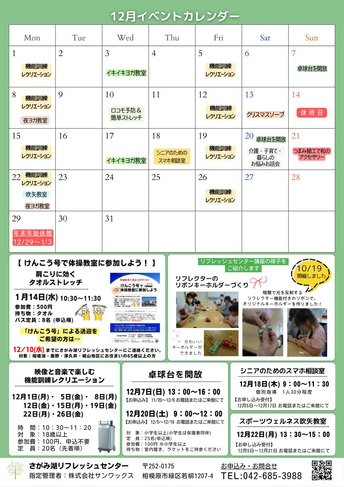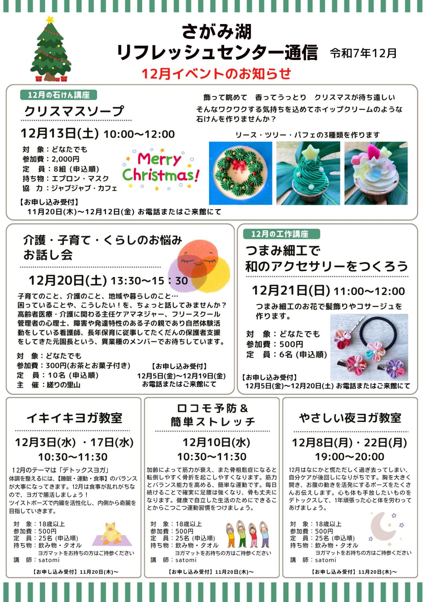 2025.11.19 「リフレッシュセンター通信12月号」 イベント情報などを掲載した「リフレッシュセンター通信」を毎月発行しています。 館内に配架しますので、是非お手に取ってご覧ください。 イベントの申し込みやお問合せはお気軽にスタッフまでお声掛けください。