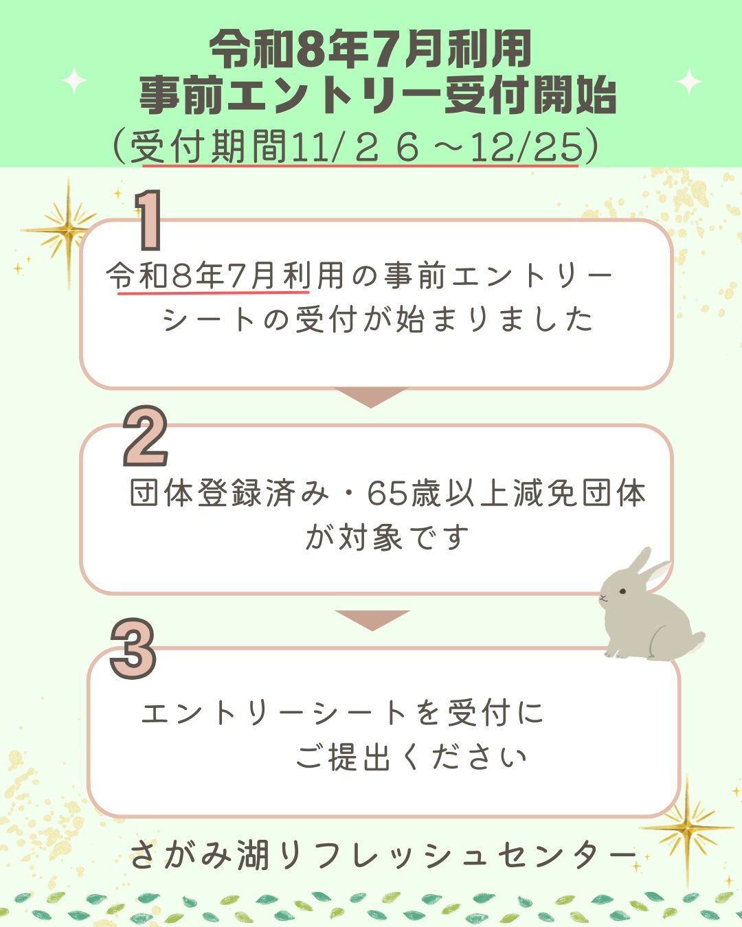 2025.12.03 令和8年7月利利用事前エントリー受付中です 令和8年7月利用の事前エントリーを受付中です。 期間:11月26日(水曜日)から12月25日(木曜日)まで 対象:団体登録済みかつ65歳以上の減免対象団体 受付にエントリーシートを提出ください。