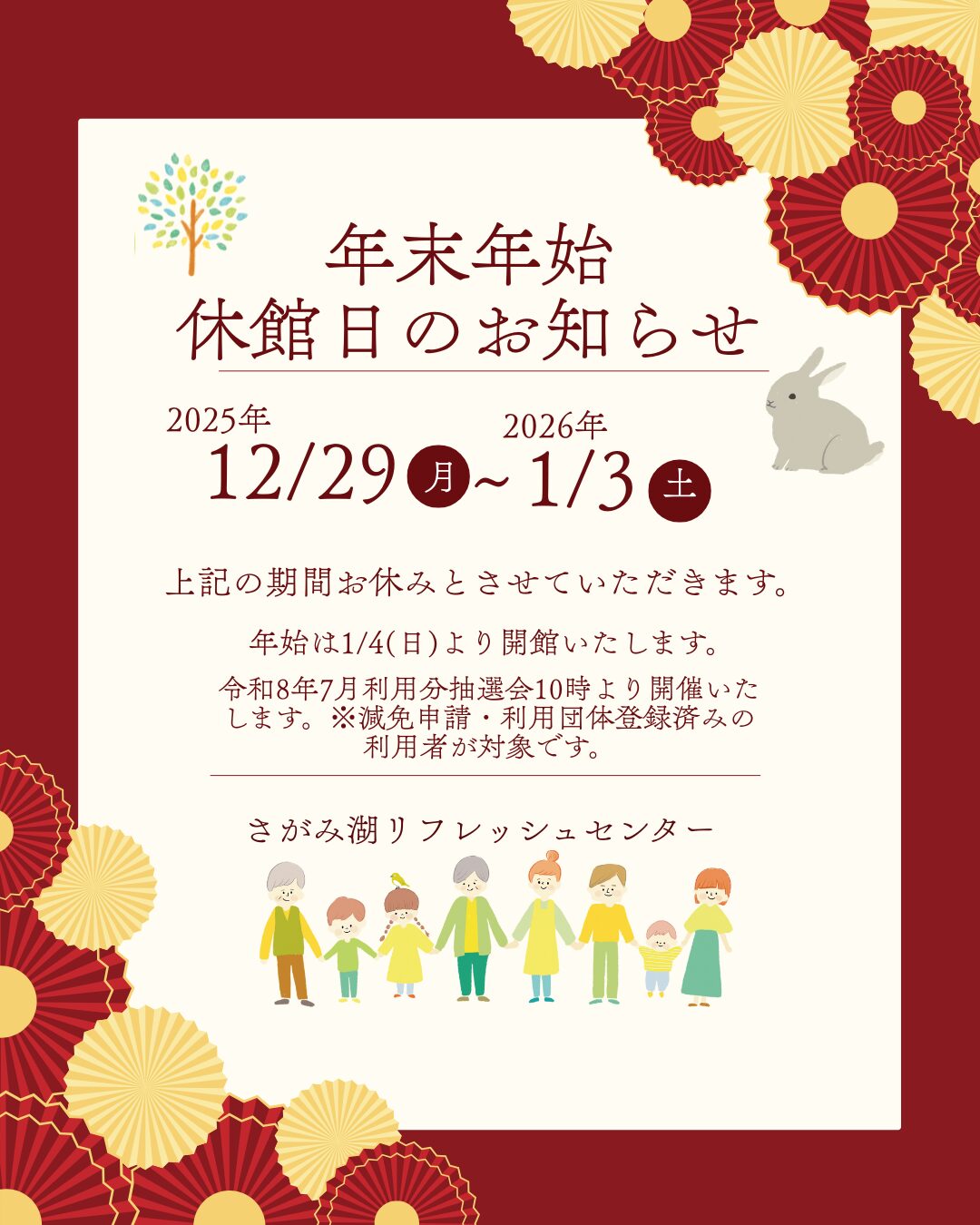 2025.12.04 年末年始休館日のお知らせ 年末年始休館日のお知らせ 日頃より、さがみ湖リフレッシュセンターをご利用いただきありがとうございます。 下記日程で年末年始休館日とさせていただきます。 ご不便をおかけしますが、どうぞよろしくお願いいたします。 休館日 2025(令和7)年12月29日(月曜日)から2026(令和8)年1月3日(土曜日) 新年は1月4日(日曜日)より開館いたします。