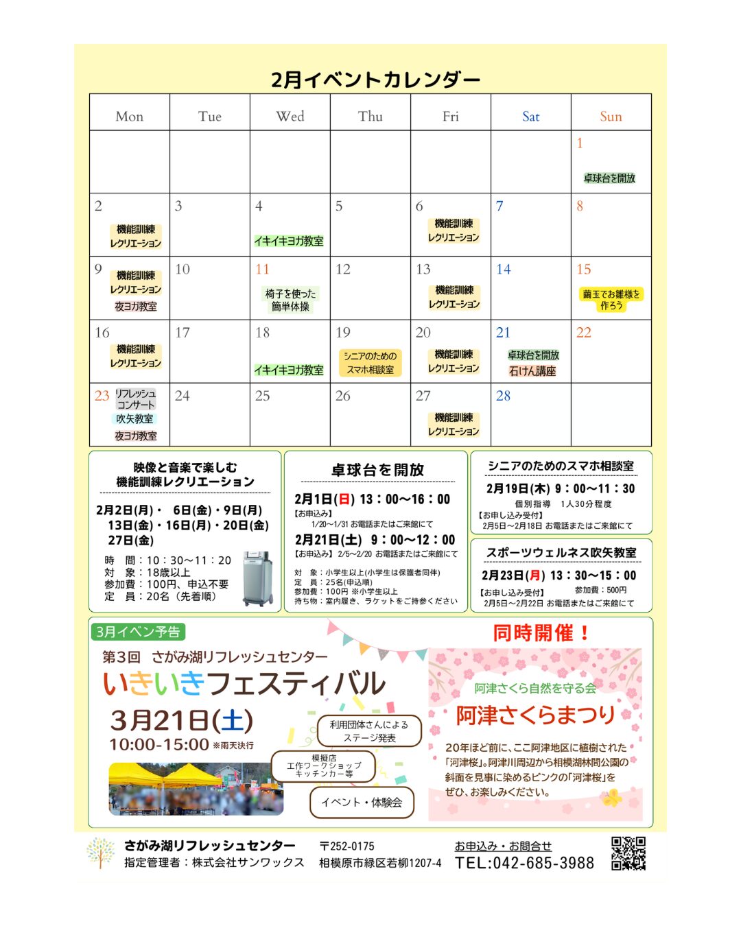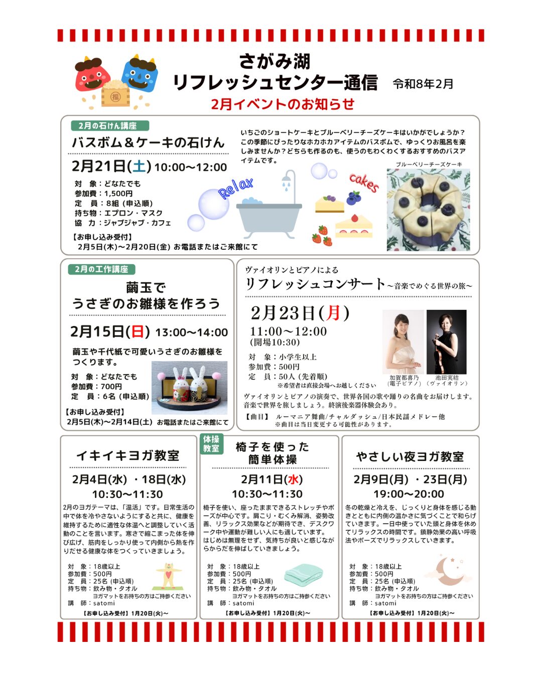 2026.01.18 「リフレッシュセンター通信2月号」 イベント情報などを掲載した「リフレッシュセンター通信」を毎月発行しています。 館内に配架しますので是非、お手に取ってごらんください。 イベントの申し込みやお問合せはお気軽にスタッフまでお声掛けください。