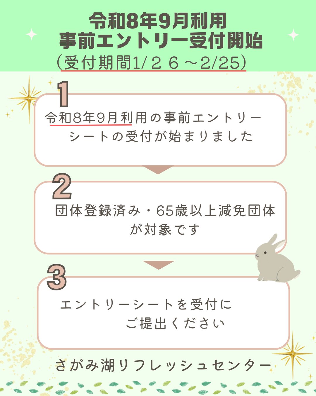 2026.01.30 令和8年9月利用事前エントリー受付中 令和8年9月利用の事前エントリーを受付中です。 期間:令和8年1月26日(月曜日)から令和8年2月25日(水曜日)まで 対象:団体登録済みかつ65歳以上の減免対象団体 受付にエントリーシートを提出してください。
