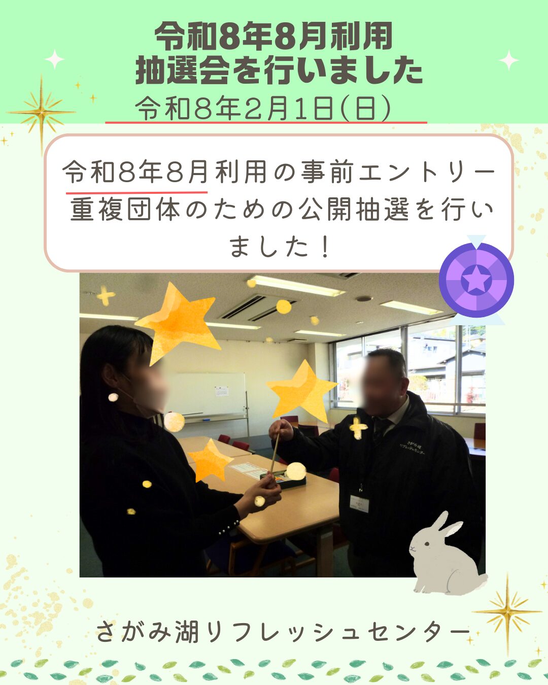 2026.02.01 令和8年8月利用公開抽選を行いました 令和8年8月利用、事前エントリーした重複団体のための公開抽選を行いました。 本日正午より本申請を承ります。皆さまのご利用、お待ちしております。